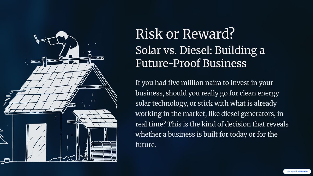 If you had five million naira to invest in your business, should you really go for clean energy solar technology, or stick with what is already working in the market, like diesel generators, in real time? This is the kind of decision that reveals whether a business is built for today or for the future.