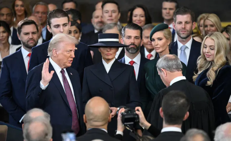 Chief Justice John Roberts administered the oath of office, with President Trump placing his hand upon two Bibles: his personal childhood Bible and the historic Lincoln Bible. Beside him stood First Lady Melania Trump, exuding grace and support.
