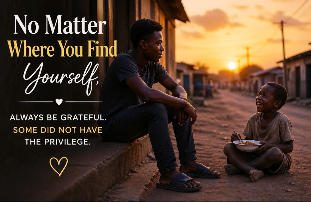 Tunde sat quietly outside his small room, tired of how life had been treating him. Nothing seemed to work, and he felt stuck. As he watched people pass by, he noticed a young boy happily eating from a small plate of food, smiling like he had everything in the world. In that moment, Tunde realized something—what he was complaining about was what someone else was praying for.