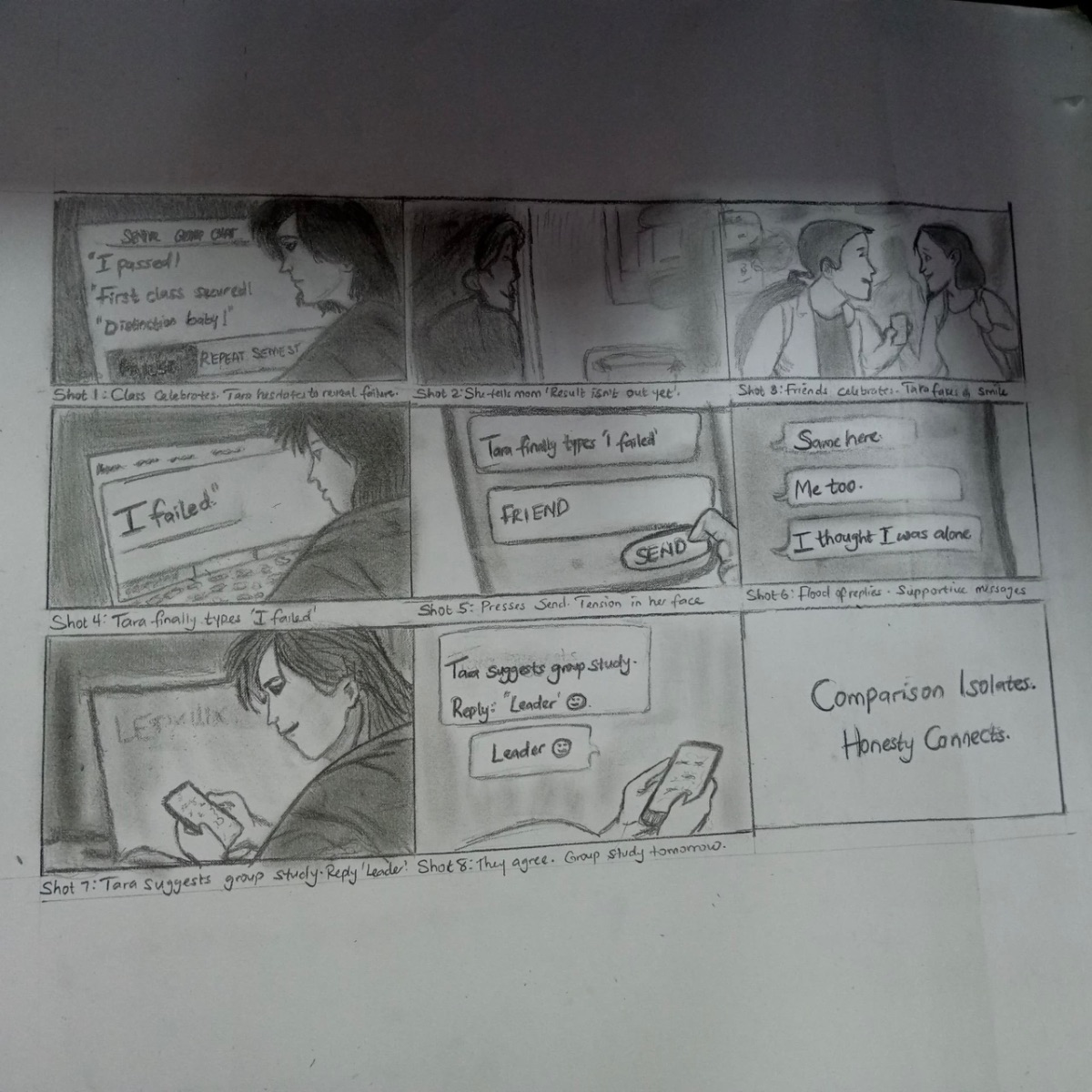 Tara secretly fails an exam while her classmates celebrate online and in person. Afraid of judgment, she lies about her result. When she finally tells the truth in the class group chat, she discovers she isn’t alone, and that honesty brings relief and connection.