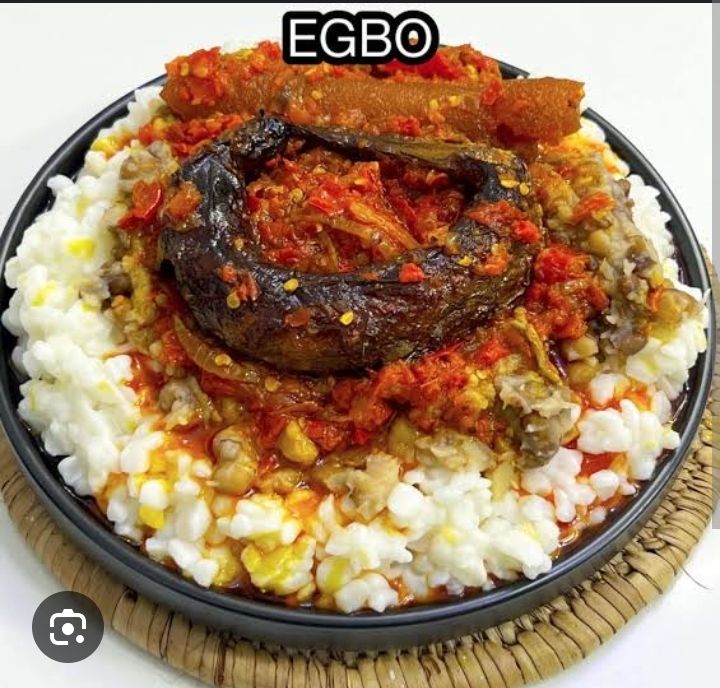 Egbo ati Ewa, sometimes called "Adalu," is a traditional delicacy made from cooked cornmeal (Egbo) and well-cooked beans (Ewa), served with a spicy pepper sauce (Atadindin). Egbo is a hearty porridge made from roughly milled corn, while Ewa refers to beans cooked to perfect softness.