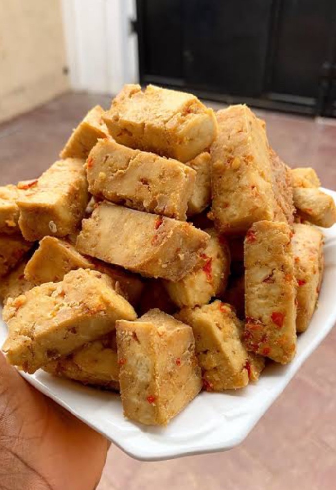 Beske, made out of soaked, peeled then blended and cooked into paste, soybean. Cut into preferred size and shape then deep fry into golden brown color which is then served with a generous amount of pepper and onions. Has slowly become not only the symbol of Ilorin’s street food identity but also becoming comfort, culture and a generally accepted food in the community bringing people together with one spicy bite at a time.